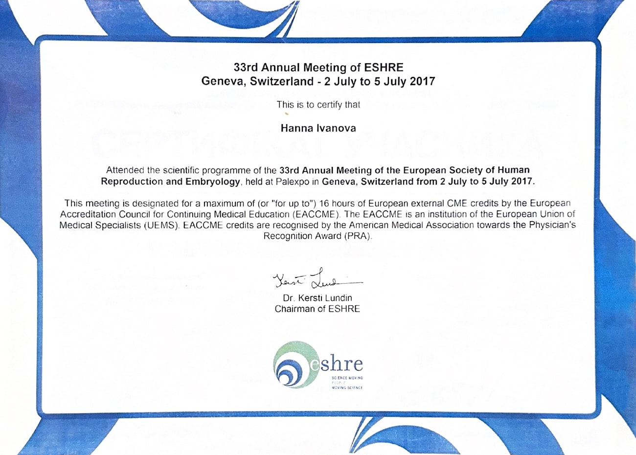 获得了生殖医学协会 (ESHRE) 的证书,证明参加了第33届年度会议。 该会议于2017年7月2日至5日在瑞士日内瓦举行