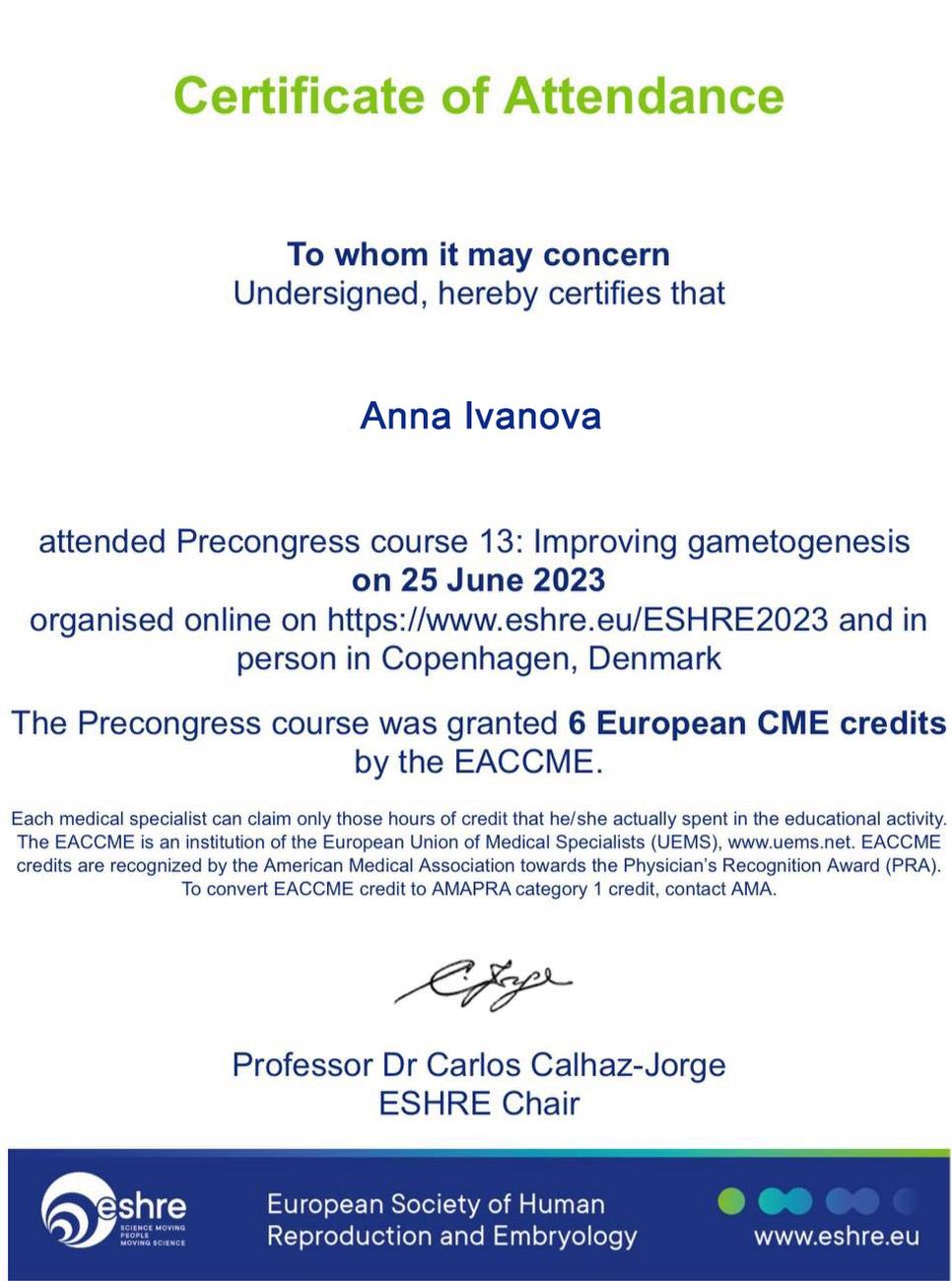 获得了生殖医学协会 (ESHRE) 的合格证书,证明参加了第13届课程,该课程于2023年6月25日在丹麦哥本哈根举办