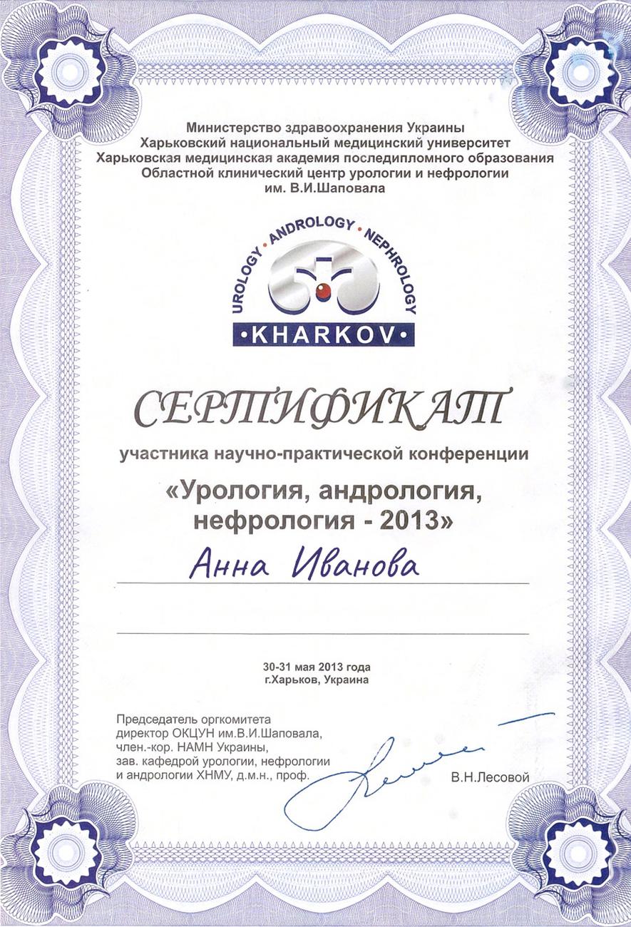 获得了科学实践会议《泌尿学、男科学、肾脏学 - 2013》的参与证书该会议于2013年5月30日至31日在乌克兰哈尔科夫市举行