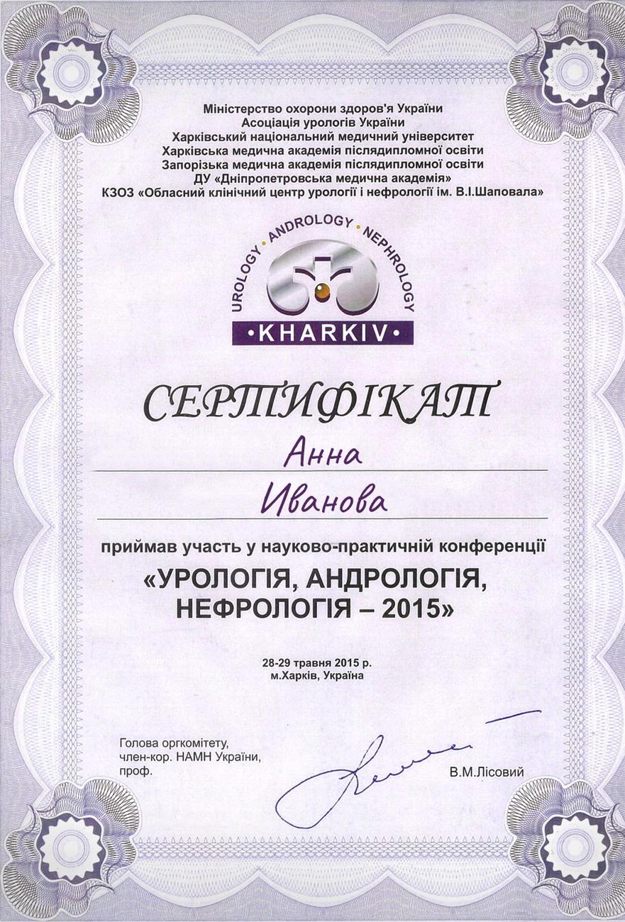 获得了科学实践会议《泌尿学、男科学、肾脏学 - 2015》的参与证书该会议于2015年5月28日至29日在乌克兰哈尔科夫市举行