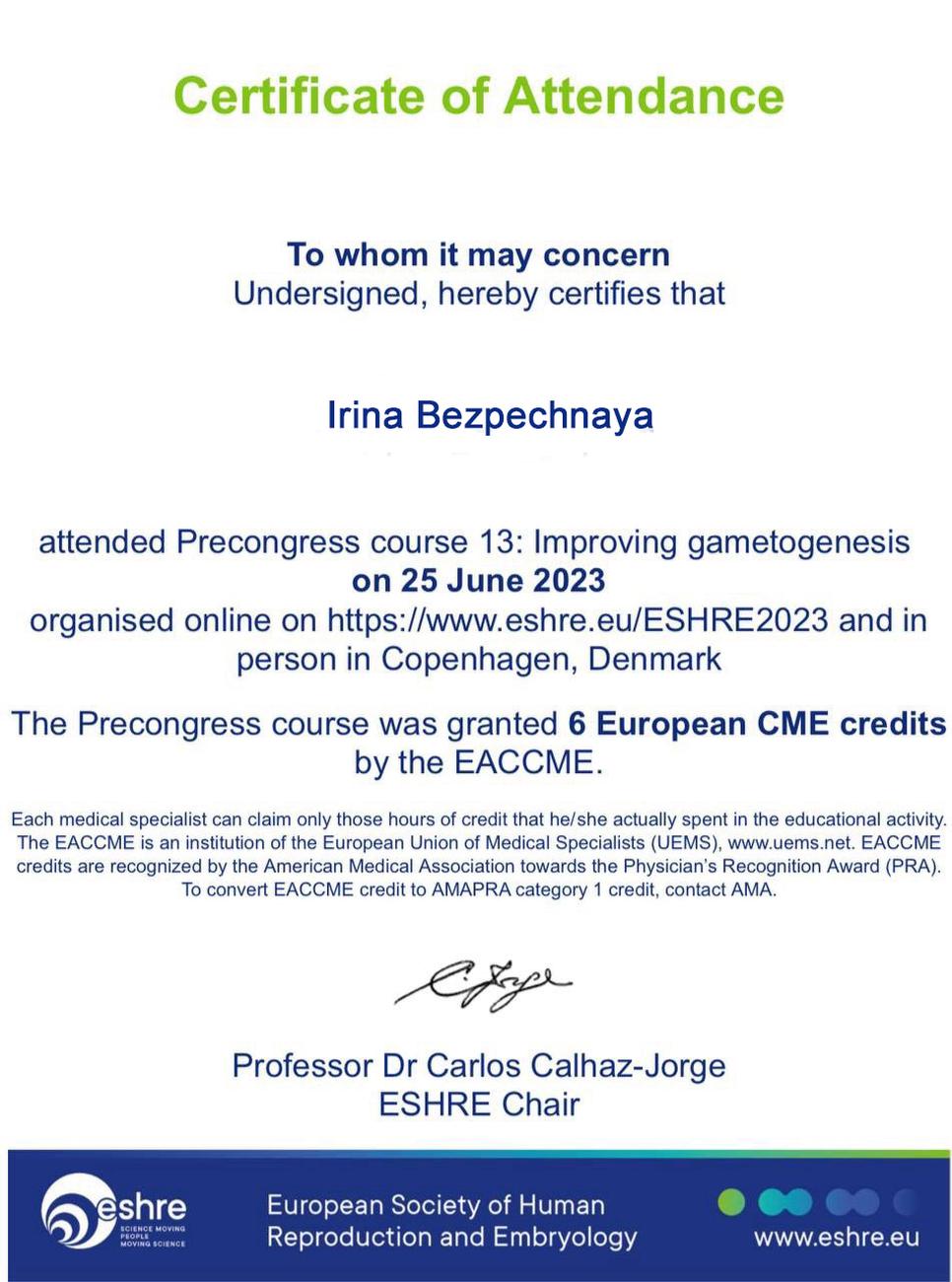 证书证明参与了生殖医学协会 (ESHRE) 第13届课程,该课程于2023年6月25日在丹麦哥本哈根举办