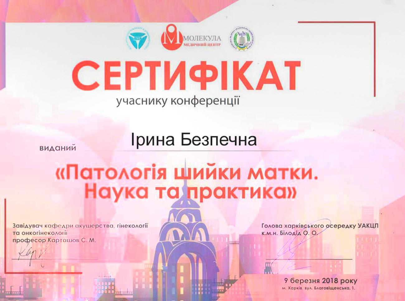 证书证明参加了名为《宫颈病变:科学与实践》的会议,该会议于2018年3月9日在乌克兰哈尔科夫市举行