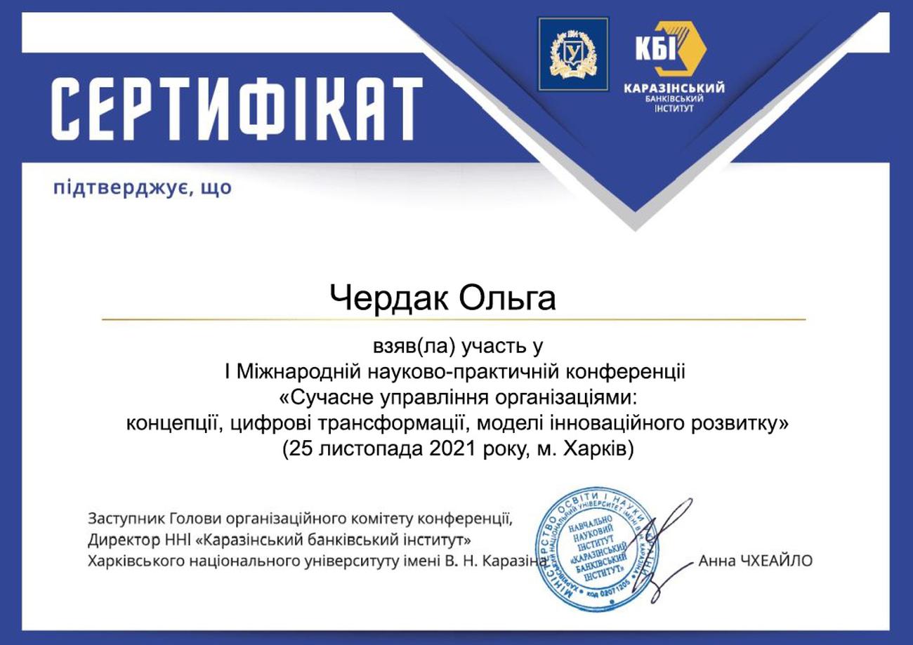 证书证明积极参与了第四届国际科学实践会议《信息社会转型条件下信息系统与智能技术的整合》,该会议于2021年10月21日至22日在乌克兰波尔塔瓦市举行