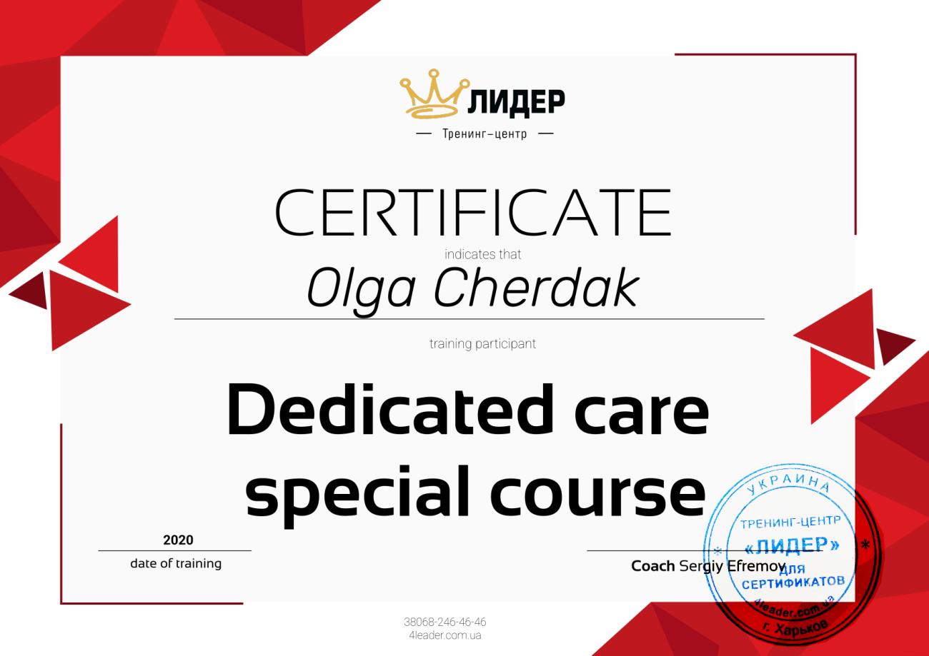 完成了《专注护理特别课程》培训课程,课程于2020年进行。 此信息由“Lider”培训中心颁发的证书确认