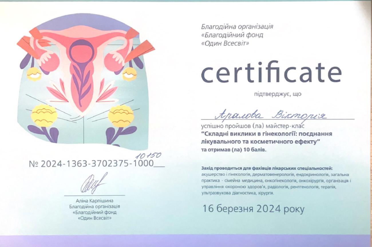 证书编号:2024-1363-3702375-10150 成功完成大师班课程:《妇科中的复杂挑战:治疗与美容效果的结合》2024年3月16日