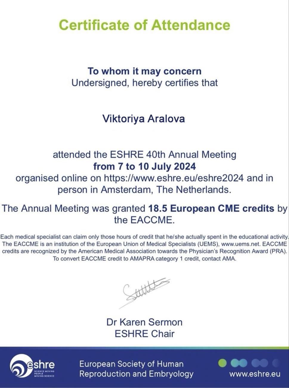 获得了参加“大师班‘De femina: 所有关于胚胎的知识’”的证书 编号:2024-1023-3701114-1000012024年3月9日