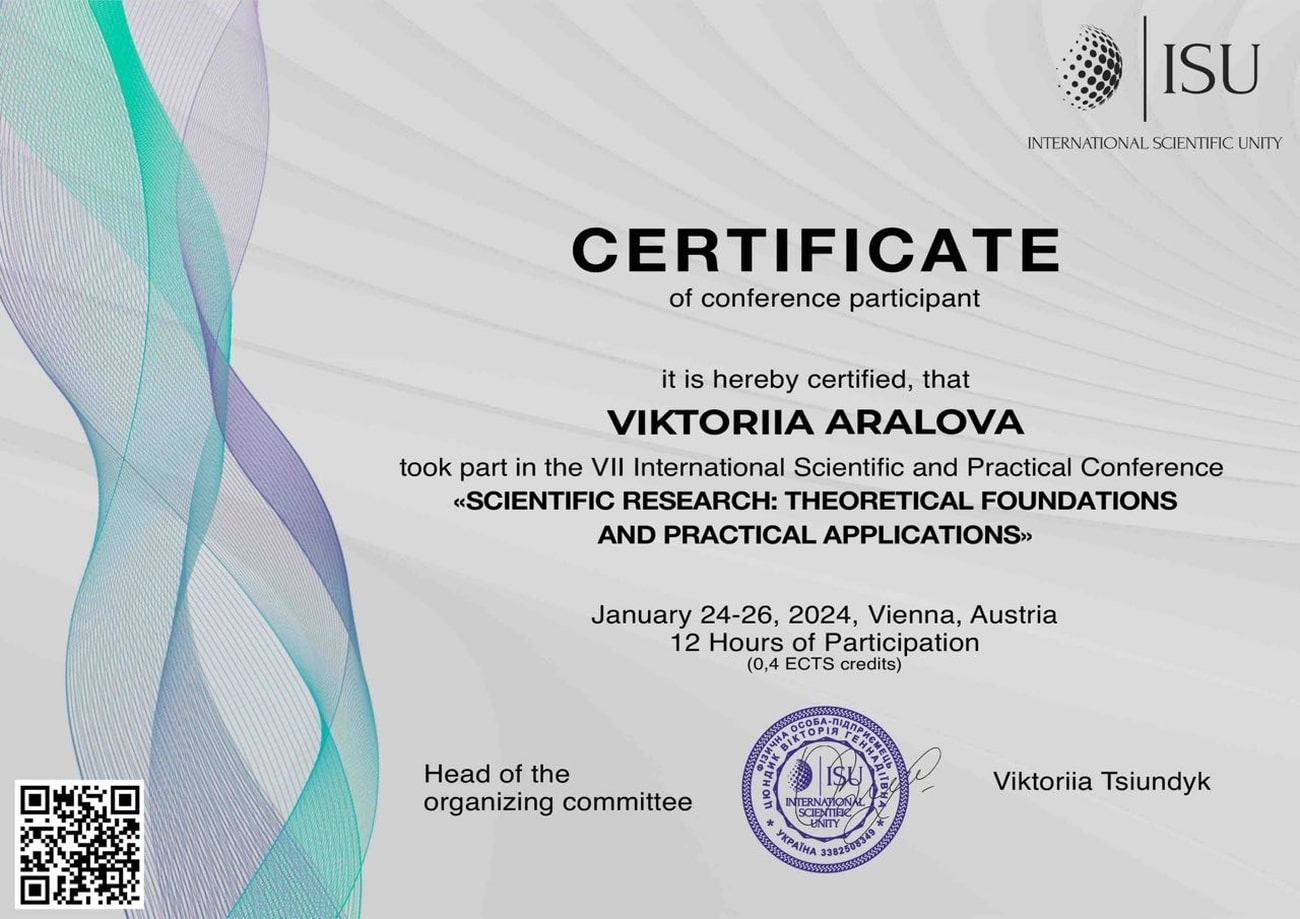 在奥地利维也纳举行了第七届国际科学与实践会议“科学研究:理论基础与实践应用”,维克托利亚·奥列戈夫娜积极参与了此次会议,并获得了参会证书。 第七届国际科学与实践会议“科学研究:理论基础与实践应用”2024年1月24日至26日