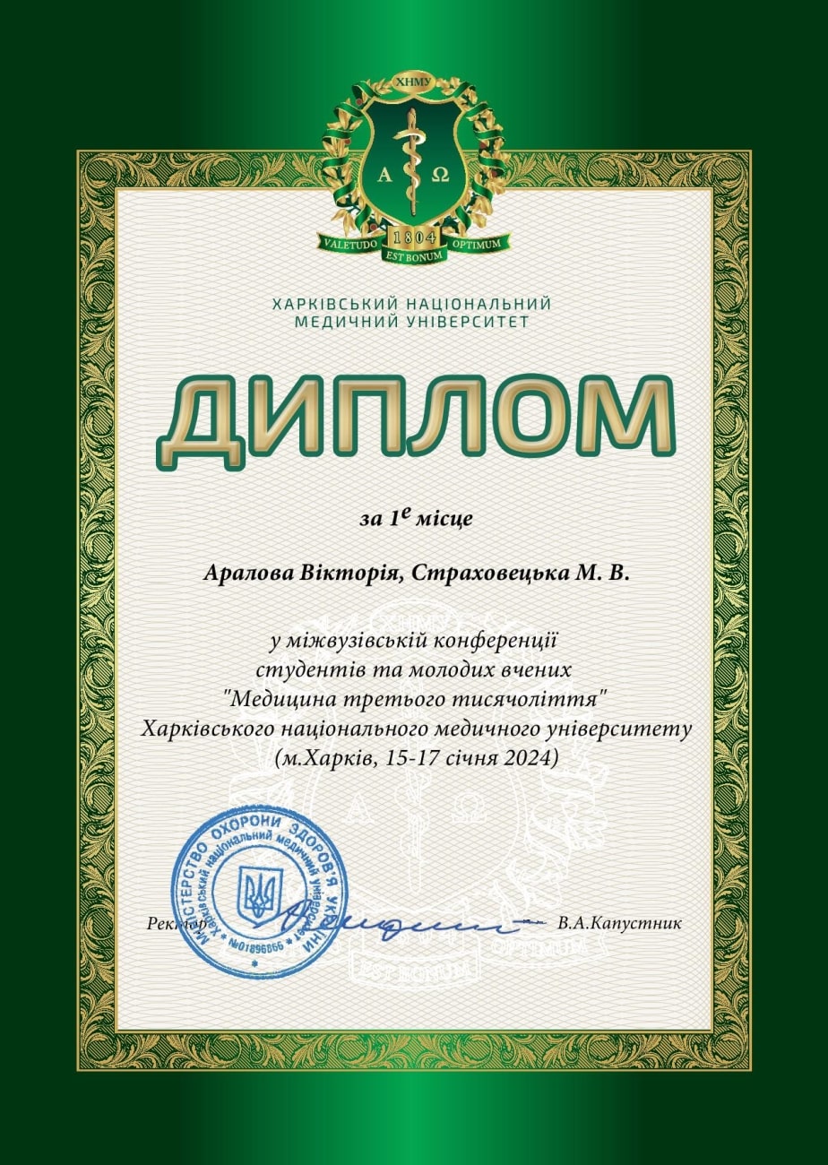 参加了在哈尔科夫国立医科大学举办的跨大学学生和青年科学家会议“第三千年的医学”,并获得了证书。2024年1月15日至17日