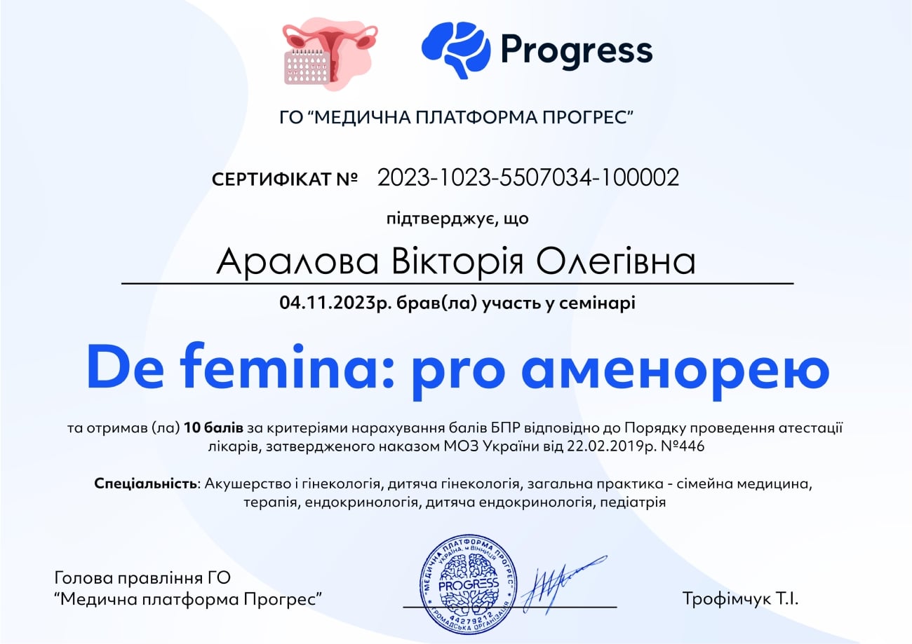 参加了题为“De femina: 关于闭经”研讨会的工作,获得证书编号为2023-1023-5507034-1000022023年11月4日